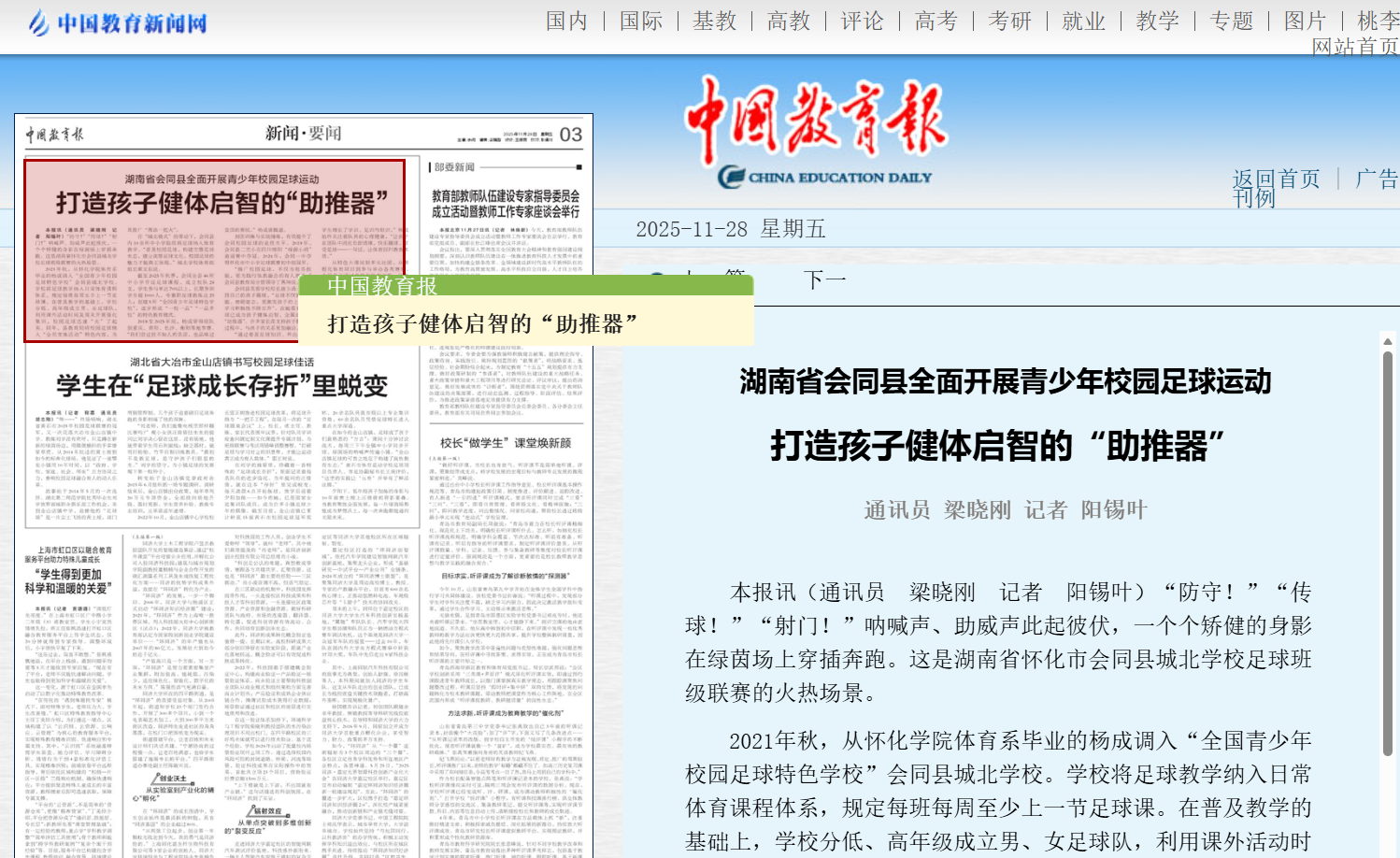 2021年秋,从怀化学院体育系毕业的杨成调入“全国青少年校园足球特色学校”会同县城北学校。学校将足球教学纳入日常体育课程体系,规定每班每周至少上一节足球课。在普及教学的基础上,学校分低、高年级成立男、女足球队,利用课外活动时间及周末开展强化集训,校园足球迅速“火”了起来。同年,县教育局将校园足球纳入“全员文体活动”特色内容,为其推广“再添一把火”。